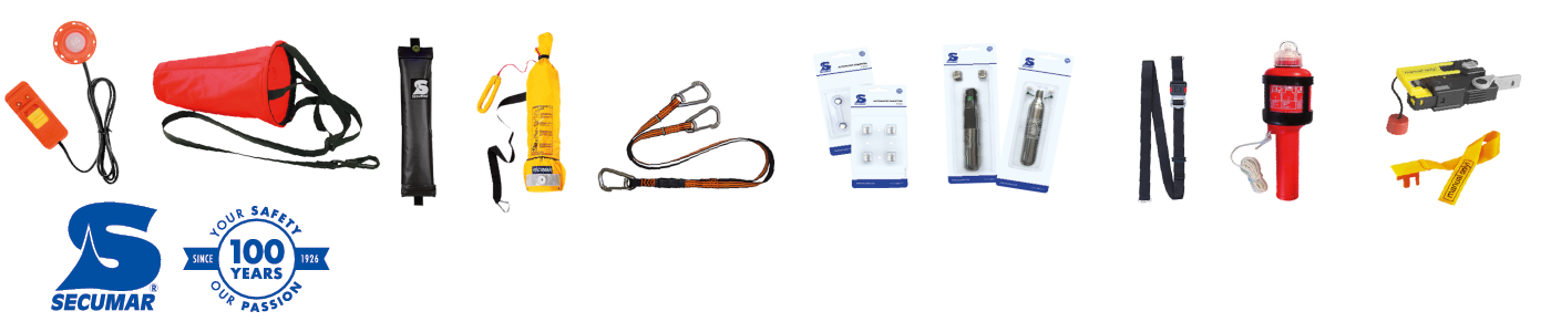 Secumar CO2-Ersatzpatronen, Reserveset, Ersatzset, Auslösetabletten, Automatiksperren, Lifebelts, Sorgleinen, Schrittgurte, Rettungswestenlichter und Spraycaps